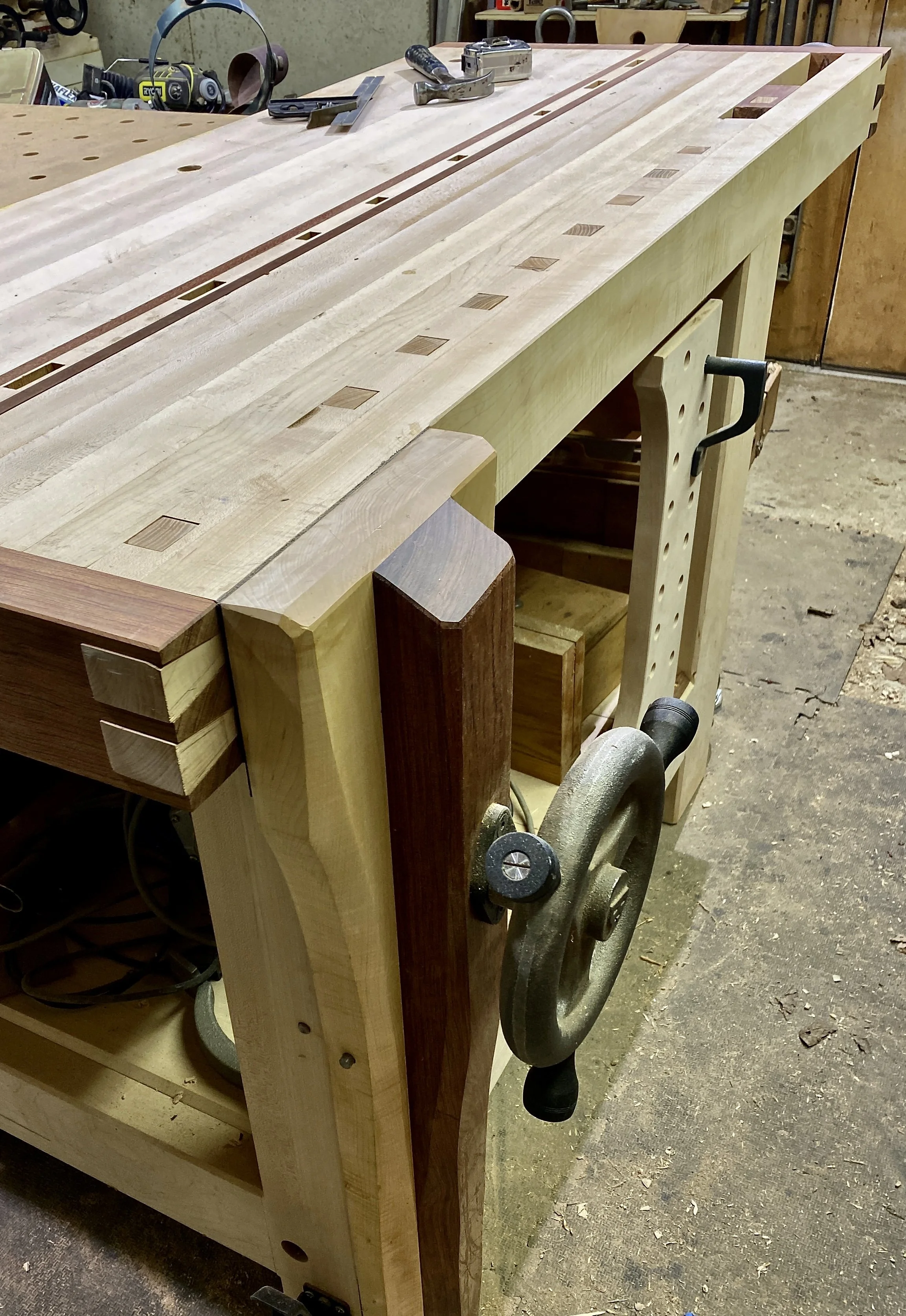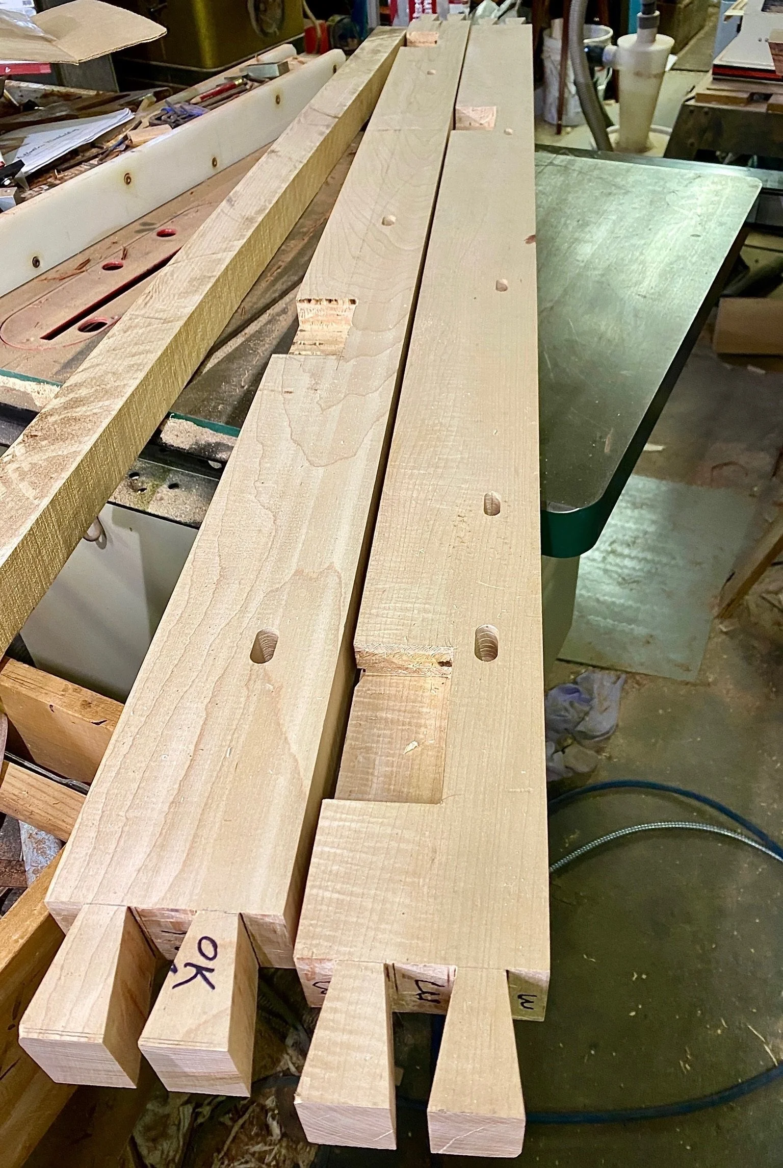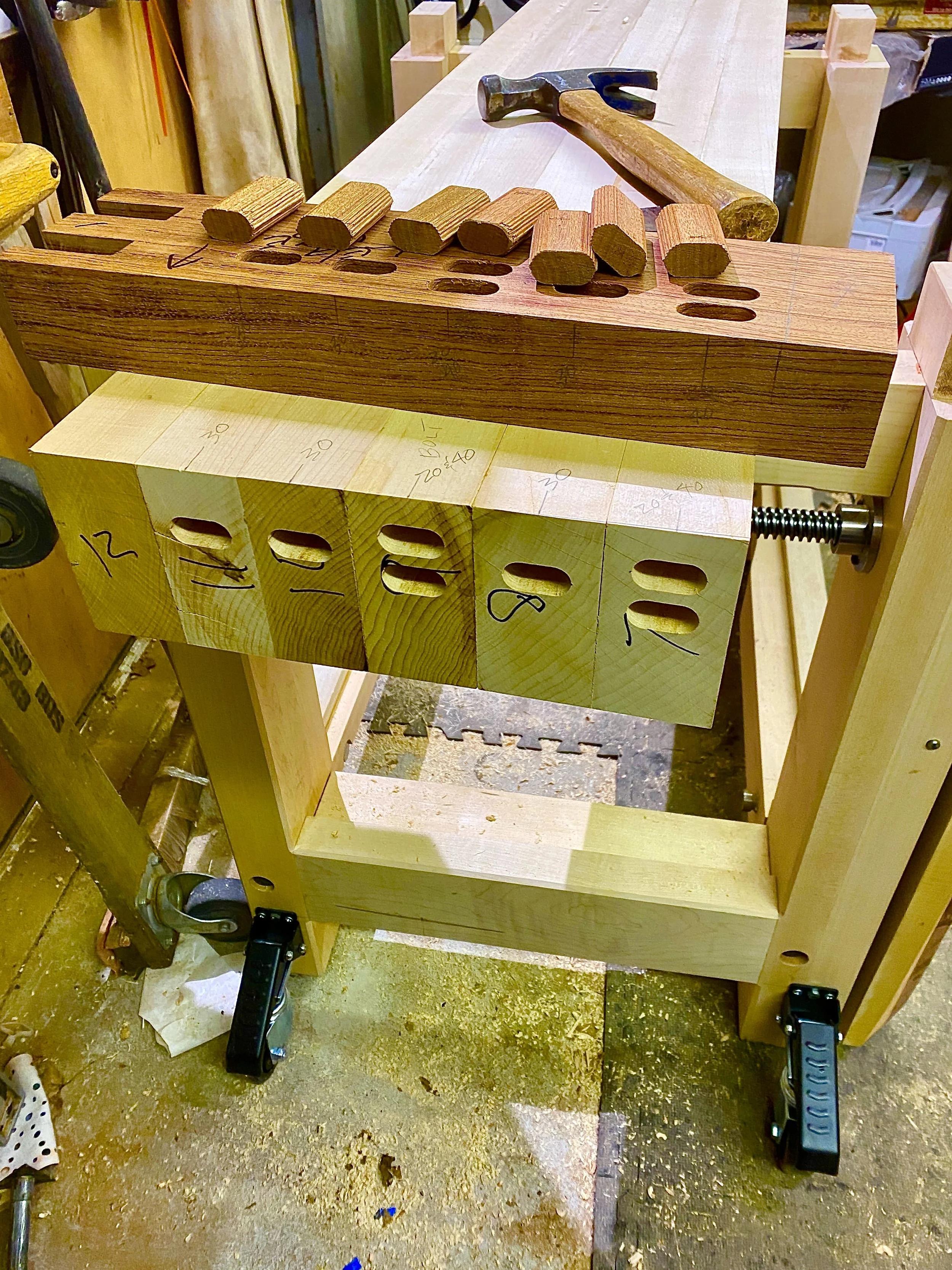 bench knocks down, 7” carriage bolts through legs thread into 1” barrel bolts in rails